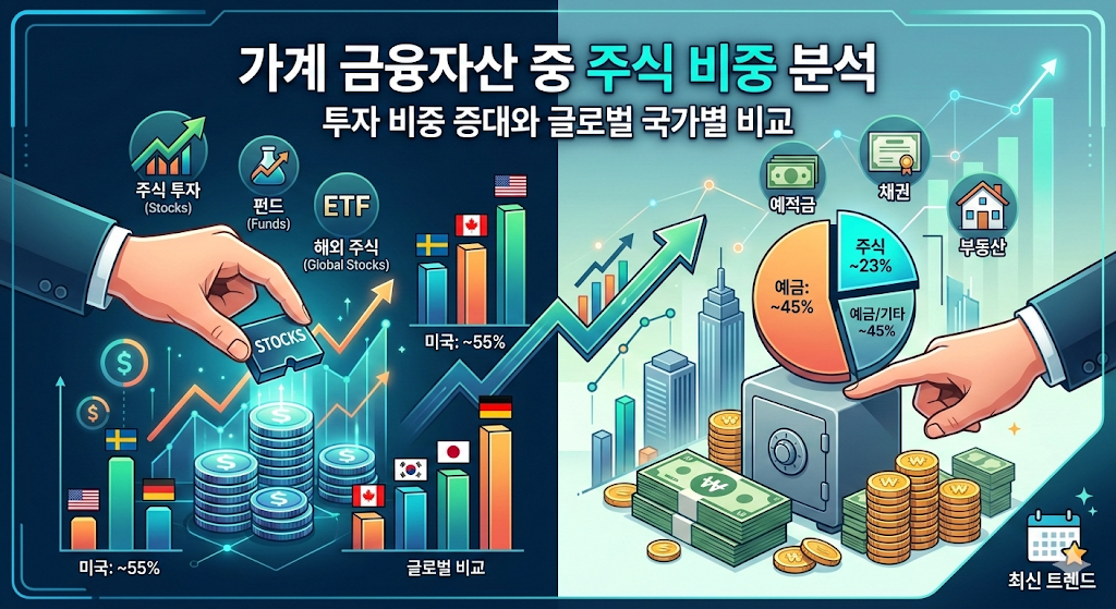 - 한국의 현주소: 한국은 가계 자산의 약 70% 이상이 부동산(비금융자산)에 묶여 있습니다. 금융자산 내에서 주식 비중은 과거 10%대에서 20%대로 올라왔으나, 여전히 예금 비중(약 45%)이 주식보다 두 배가량 높습니다.