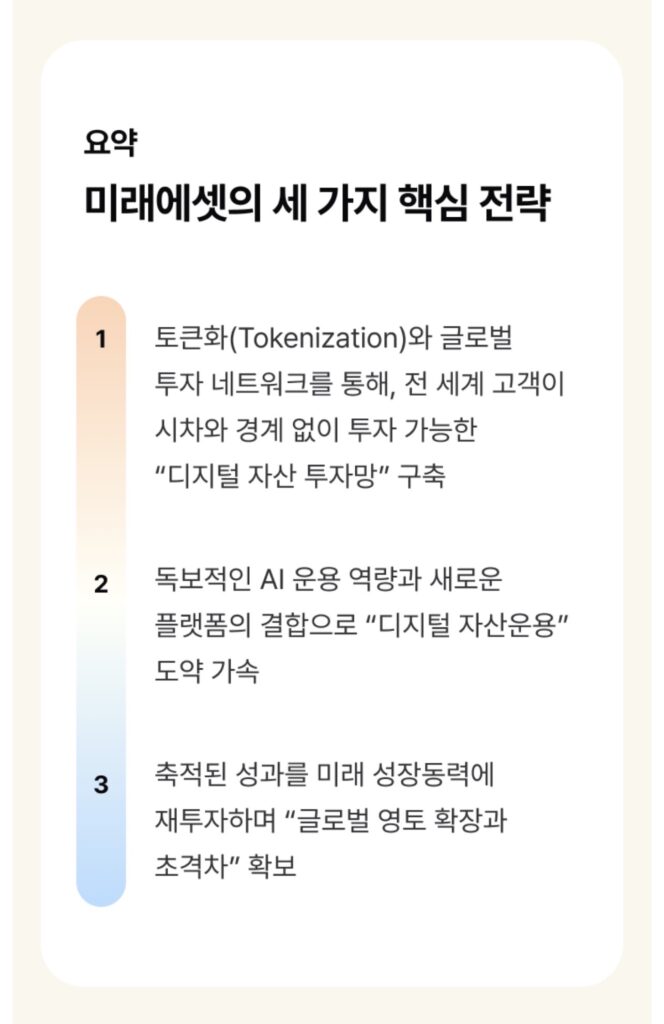 말은 거창하지만, 구조를 풀어보면 비교적 명확합니다. 여기서 말하는 ‘미래에셋’은 미래에셋자산운용과 미래에셋증권을 축으로 한 그룹 전략을 뜻합니다. 핵심은 “자산을 디지털화하고, AI로 운용하며, 글로벌로 확장한다”는 세 줄로 정리됩니다. 하나씩 분해해 보겠습니다.