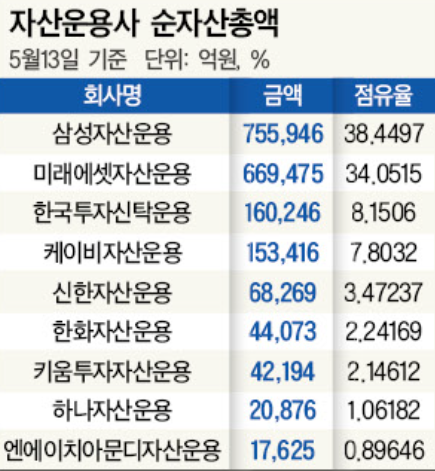 1위 삼성자산운용, 2위 미래에셋자산운용, 3위 한국투자신탁운용(ACE), 4위 KB자산운용, 5위 신한자산운용