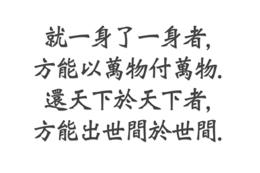 자신의 몸에서 집착을 끊고 본래의 자아를 깨달은 사람이라야 비로소 만물을 있는 그대로의 만물로 돌려보낼 수 있고, 천하를 천하 사람들의 것으로 돌려주는 사람이라야 비로소 이 세상에 살면서도 세상의 속박에서 벗어날 수 있다.