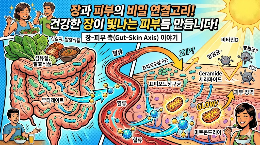 최근 학계가 주목하는 더 놀라운 사실은 피부 미생물의 건강이 장에서 시작된다는 점입니다. 이른바 ‘장-피부 축(Gut-Skin Axis)’이라 불리는 연결 고리입니다. 2025년 ‘것 마이크로브스’ 리뷰에 따르면, 장내 유익균이 식이섬유를 분해할 때 생성되는 부티레이트(단쇄지방산)가 혈류를 타고 피부까지 전달됩니다. 이 성분은 피부 세포의 에너지 공장인 미토콘드리아를 활성화해 장벽 물질의 생산을 촉진합니다. 실제로 고섬유 식단을 섭취해 장내 부티레이트가 증가한 동물은 아토피 증상이 뚜렷하게 완화되는 결과를 보였습니다.